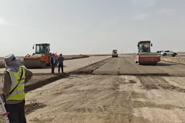 项目团队在施工过程中克服了地域差异和风沙大等恶劣自然环境,科学统筹、加强调度,与各个施工班组紧密联动,高效完成各项施工任务。通过“人力动态调配+物资智能储备”优化资源配置,高强度高质量高效能施工,施工高峰期时300辆水稳运输车同时作业。严格落实集团标准化管理,提前完成路床换填,尽显项目团队专业攻坚能力。项目施工遇沙尘暴天气,项目部全体建设者主动加压提速,每周进度碰头会实时监控进展,发现偏差及时纠偏,确保各项关键节点高质高效完成。