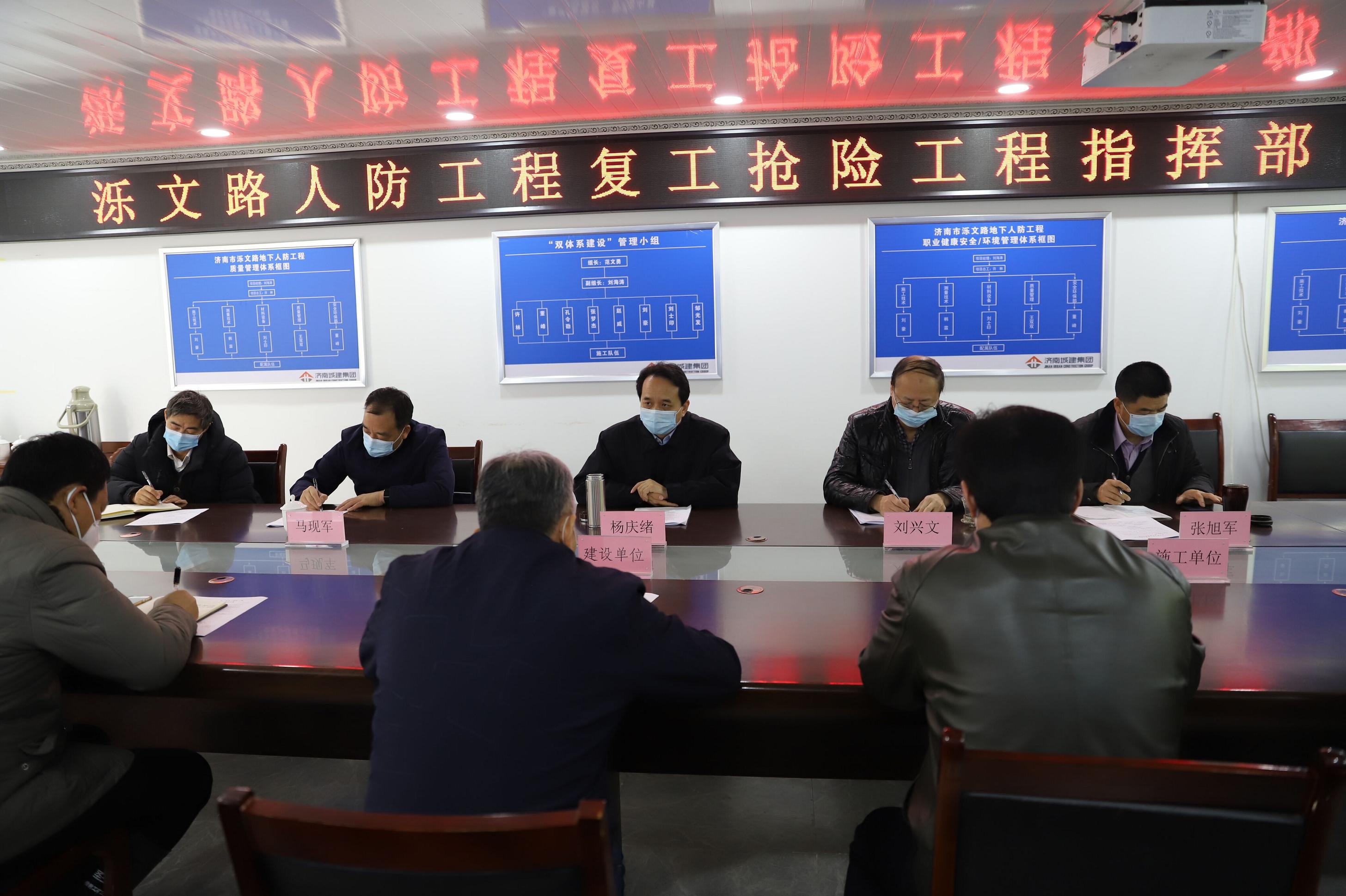 2月28日上午,济南市人民防空办公室党组书记、主任杨庆绪及副主任刘兴文等一行,到五分公司承建的济南市泺文路地下人防工程督导检查工程应对新冠肺炎疫情防控措施落实及复工复产情况。集团副总经理兼五分公司经理马烽等陪同。