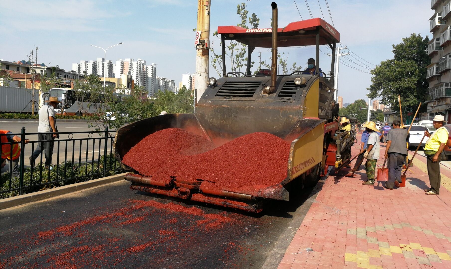 6月22日早8点,刘长山路道路改造工程慢车道彩色沥青面层摊铺正式拉开帷幕。