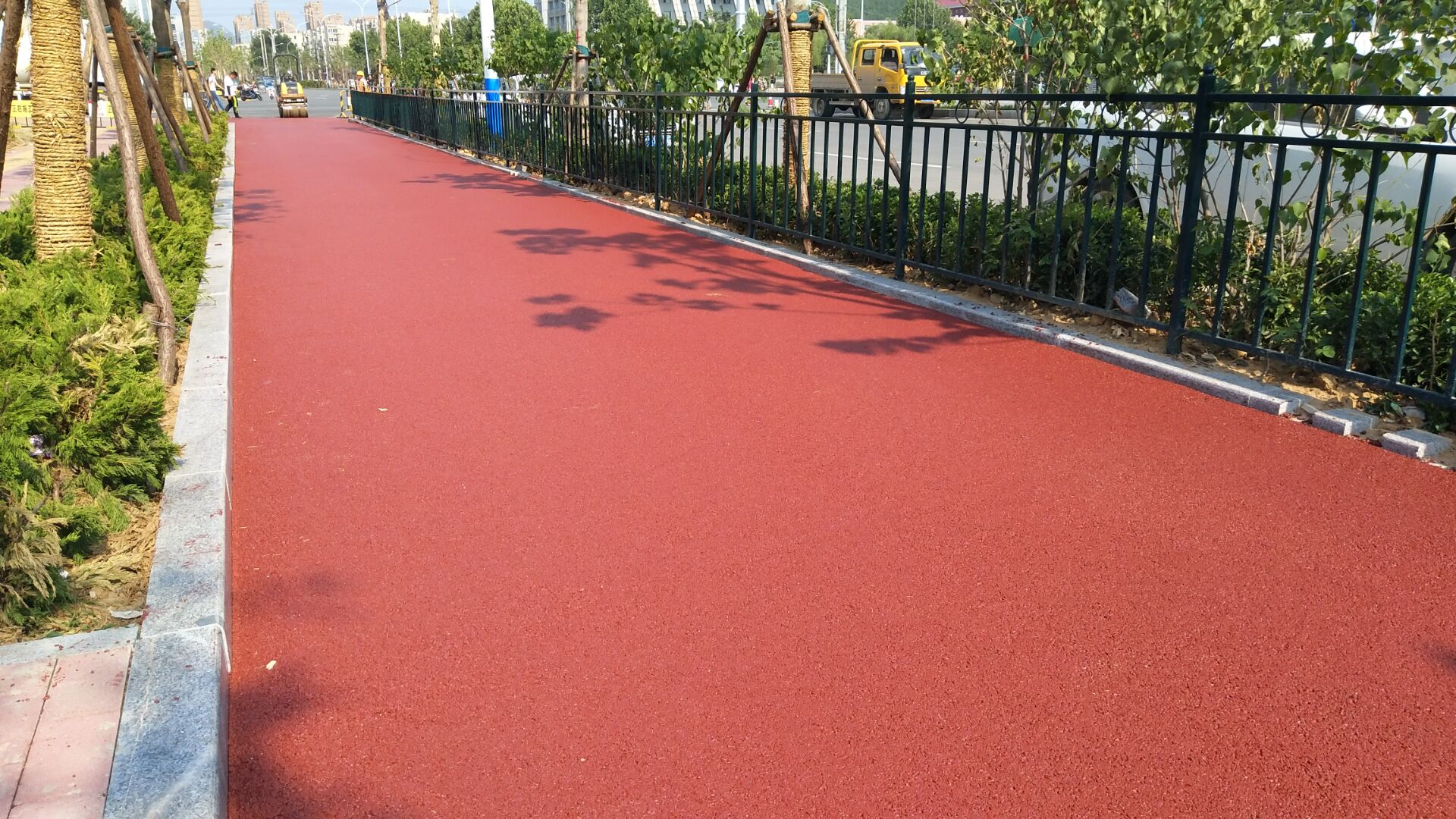 此次摊铺施工为期4天,摊铺面积1.5万平方米,预计25日完成。摊铺过程中,施工人员根据彩色沥青的施工要求,特别注意施工过程的策划和清洁控制,从出料、运输到现场施工中的清洁处理都做了详细的布置和要求,施工项目部与摊铺项目部通力协作,密切配合,将保质保量完成此次摊铺任务。