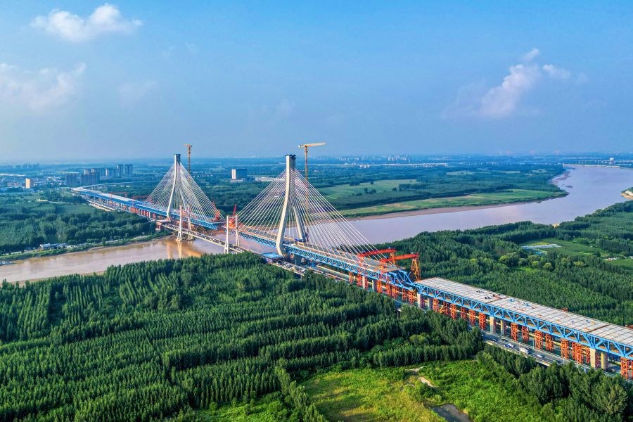 G104济南黄河公路大桥扩建工程位于济南市历城区和动能转换起步区,大桥全长2518米,主桥全长1028米,主跨跨径488米,总计用钢量约7万吨,是黄河上跨径最大、钢桥总长最长的公轨分层合建桥梁。该工程承担着贯彻落实黄河流域生态保护和高质量发展重大国家战略使命,是深入贯彻落实习近平总书记重要指示要求、全力抢抓黄河流域生态保护和高质量发展重大国家战略机遇、加快建设新旧动能转换起步区的重大标志性工程,在济南城市发展史、黄河流域跨黄通道建设史上都具有重要里程碑意义。