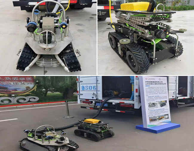集团创新研发的管道清淤机器人、管道雷达检测机器人两款智能建造高新装备均达到IP68等级,可在管道满水情况下作业。其中,管道清淤机器人对管道内淤堵采用声呐定位,前端搭载高压喷头及吸污口,实现DN800及以上管径管道的快速高效清淤;管道雷达检测机器人搭载高性能防水雷达天线,并设有升降装置,可根据不同管径,灵活调整雷达高度,实现DN800及以上管径管道内表面及壁后缺陷的精准检测。