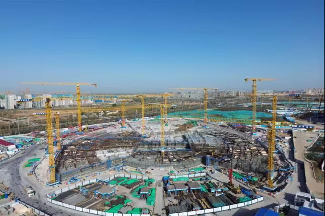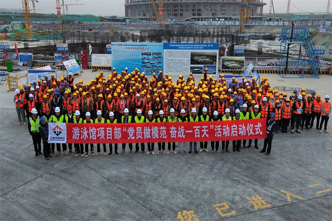 开局决战,展现城建速度。集团承建的济南起步区黄河体育及科技园区基础设施一期工程游泳馆及全民健身中心施工项目设计为甲级体育建筑,总建筑面积为16.63万平方米,总座席数约4000 座,地上部分为游泳跳水馆和全民健身功能。项目包括“水主题”健身休闲活动中心、“水主题”文化展示活动中心、时尚体育中心三大部分。工程建设初期,项目团队第一时间召开动员大会,全力疏通施工“痛点、难点、堵点”,坚持高标准、严要求施工原则,完成土方开挖16.6万立方米,混凝土浇筑38400立方米,钢筋绑扎5680吨,高质高效推动项目建设。