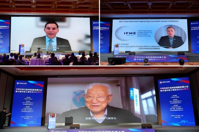 国际市政工程协会秘书长斯科特·格雷森,国际市政工程协会主席威乐·阿拉珀特,中国工程院院士崔俊芝通过视频为大会致辞。