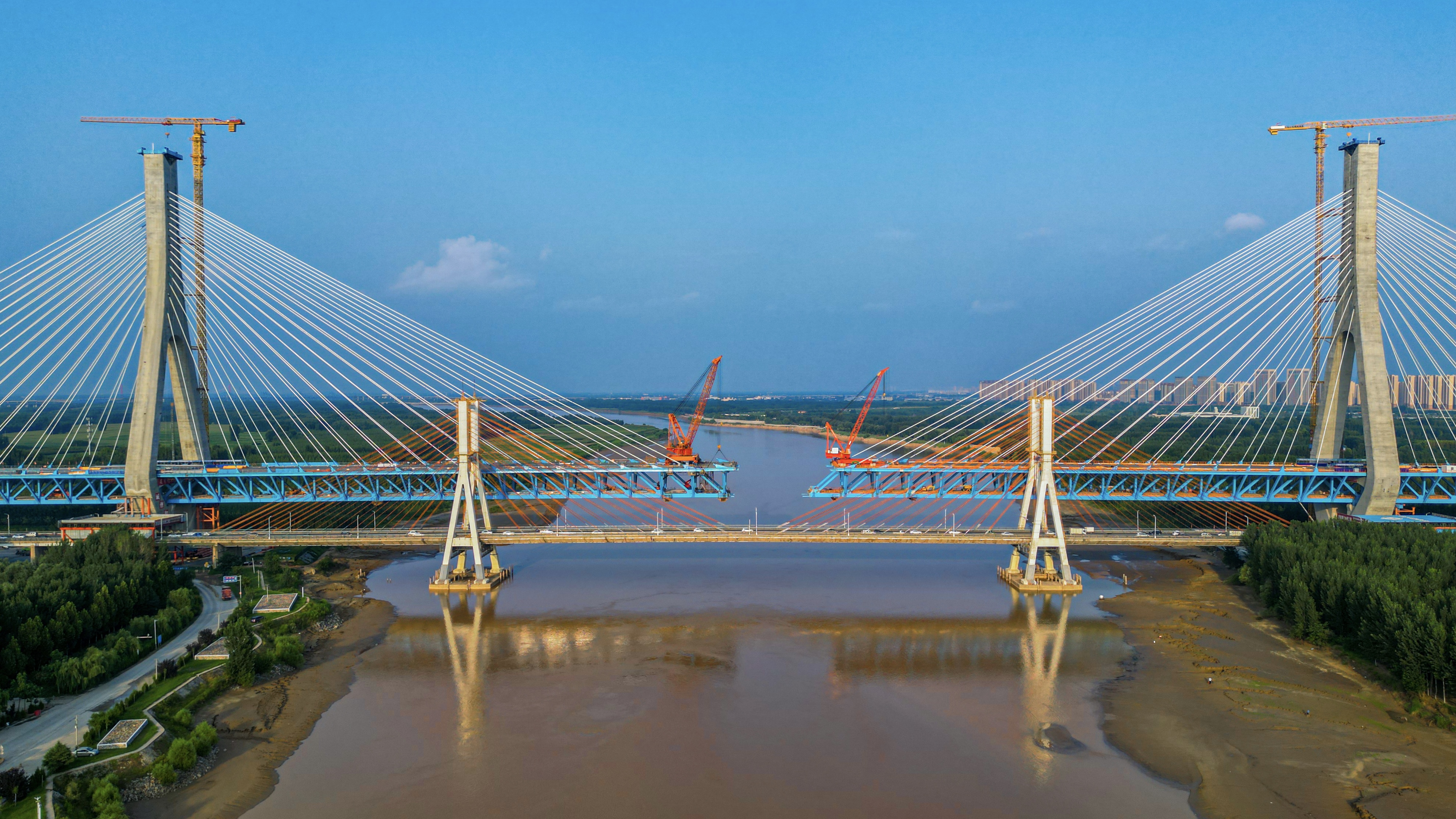 携河北跨,交通先行。8月21日下午16时,集团承建的G104黄河公路大桥完成合龙前最后一块钢桁梁桥面吊装,至此黄河大桥主桥中跨17个节间全部架设完成,南北两端已近在咫尺,按照计划,9月份大桥将实现合龙。