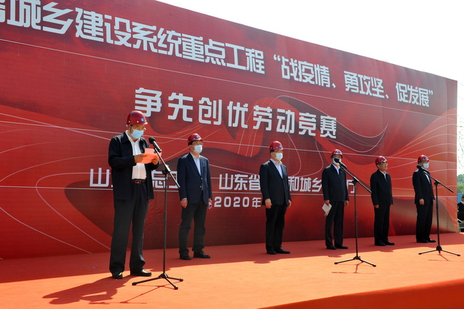 4月30日,全省住房城乡建设系统重点工程“战疫情,勇攻坚,促发展”争先创优劳动竞赛启动仪式在济南绿地国博城会展中心施工现场举行。省委常委、统战部部长、省总工会主席张江汀,副省长、省政府党组成员刘强,省总工会党组书记、常务副主席刘贵堂,省住房城乡建设厅厅长王玉志,集团工会主席朱相波参加仪式。
