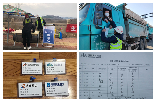 根据集团开(复)工专项疫情防控方案要求,项目部编制详细的防控方案,要求选用济南周边县市施工人员,提前摸排查明人员14天身体状况、行动轨迹,并出具复工人员健康证,确认无误登记备案后,由项目部组织专用车辆点对点接送。项目部办公区、生活区、施工现场采取全封闭管理,均只设一个进出口;设置体温检测点,所有人员均需日常体温检测两次,详细记录人员信息、体温、进出原因等信息;各区域实行每天三次消毒并安排责任到人。同时,对各参建单位人员实行联防联控,制作佩戴实名制胸卡,出入现场实行实名登记测温,严禁未登记人员进入施工区域。
