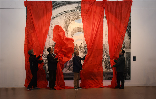 伴随着大气恢宏的音乐,中国美术家协会理事、山东省美术家协会驻会常务副主席张宜,济南市美术家协会主席李庆杰,济南市美术家协会顾问、一级美术师周群及集团工会主席、总经济师朱相波共同为《吾问西东》作品揭幕,瞬间,欢呼声此起彼伏,在70年代初建成的红砖穹顶老建筑里,我们仿佛还听到了画作中中西方伟人穿越时空聚在一起的交流声、辩论声……扣人心扉,令人深思、遐想。