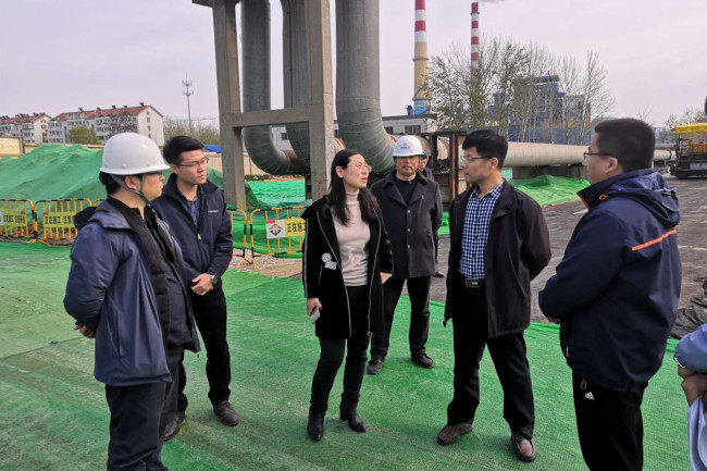 4月11日,烟台经济技术开发区管委副主任闫庆华察看一分公司承建的烟台金沙江路道路及电力管廊工程。开发区建设交通局副局长于荣和金沙江路项目相关负责人陪同。