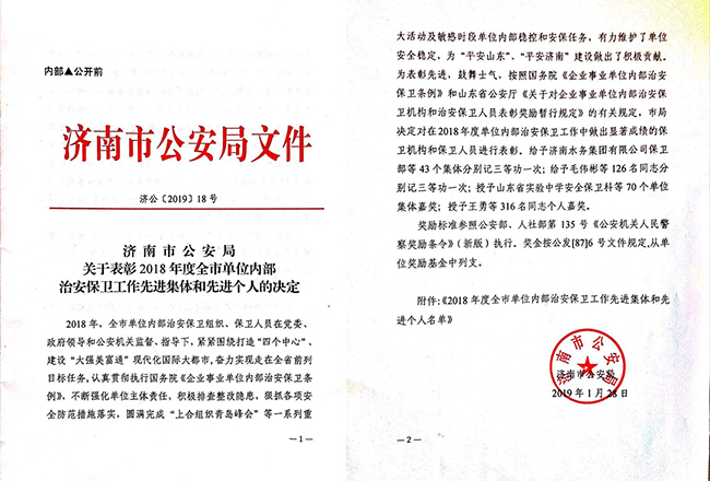 2018年,集团认真贯彻落实习近平总书记有关安全生产和和谐稳定的指示精神,在集团领导的大力支持和全体职工的共同努力下,切实发挥安全保卫主体责任,不断强化内部治安管理,狠抓各项安全防范措施落实,积极排查及时消除安全隐患,严格防范不稳定因素,营造了安全和谐的生产秩序和工作环境,实现了集团安全形势持续平稳。集团荣获济南市公安局2018年度全市单位内部治安保卫工作“集体嘉奖”荣誉、爆破分公司荣获“集体三等功”荣誉、一分公司经理李江荣获“个人三等功”荣誉。