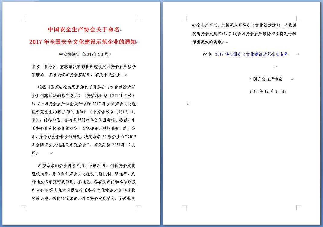 12月25日,中国安全生产协会下发《关于命名2017年全国安全文化建设示范企业的通知》(中安协综合〔2017〕38号),集团获得2017年“全国安全文化建设示范企业”(全国共80家企业,山东省仅有4家)荣誉称号。