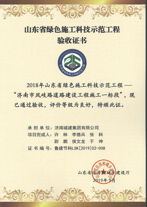 济南市凤歧路道路建设工程施工一标段被评为2018年山东省绿色施工科技示范工程