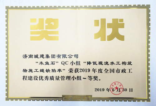 集团“木鱼石”QC小组《降低现浇水工构筑物施工缝缺陷率》荣获“2019年度全国市政工程建设优秀质量管理小组一等奖”