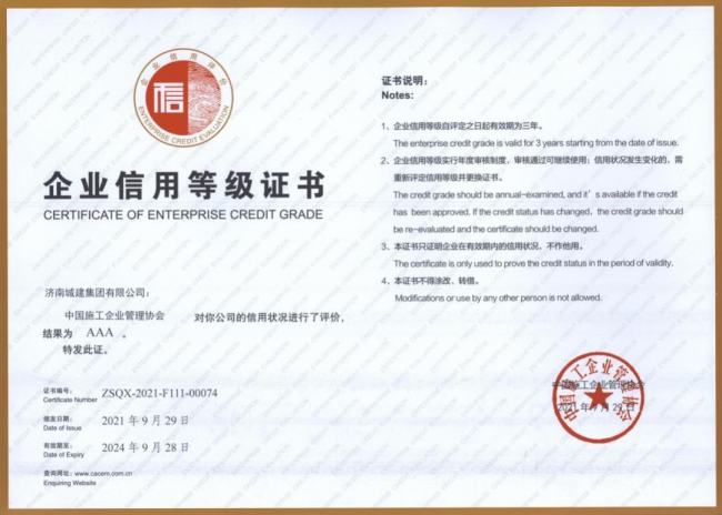 集团荣获“2021年度工程建设诚信典型企业”,集团及子公司山东汇通建设集团均被复评为“工程建设AAA级信用企业”。集团党委书记、董事长、总经理牟晓岩同志荣获“2021年度工程建设诚信企业家”称号。