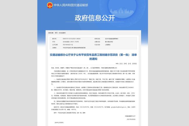 国家交通运输部发布了《交通运输部办公厅关于公布平安百年品质工程创建示范项目(第一批)清单的通知》(交办安监函〔2021〕932号),集团承建的济南绕城高速公路二环线西环段工程荣获“平安百年品质工程创建示范项目”。