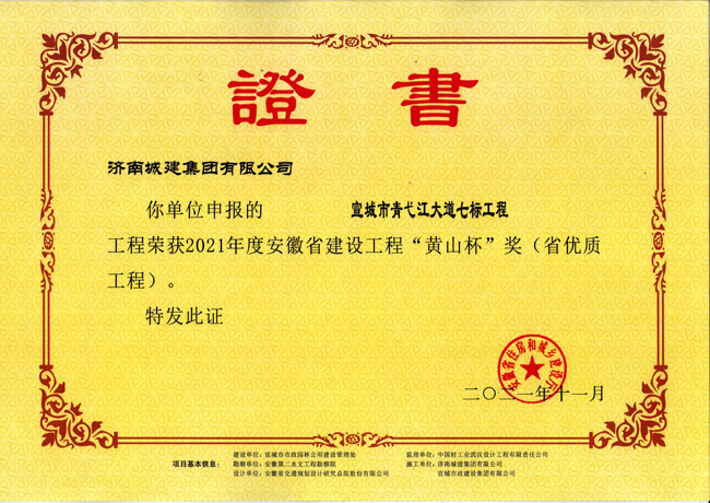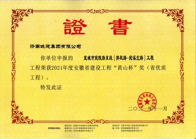 近日,集团承建的宣城市宛陵路东段(拱极路-宛溪北路)工程、宣城市青弋江大道七标工程荣获安徽省建筑行业建设工程质量的最高荣誉奖“黄山杯”。