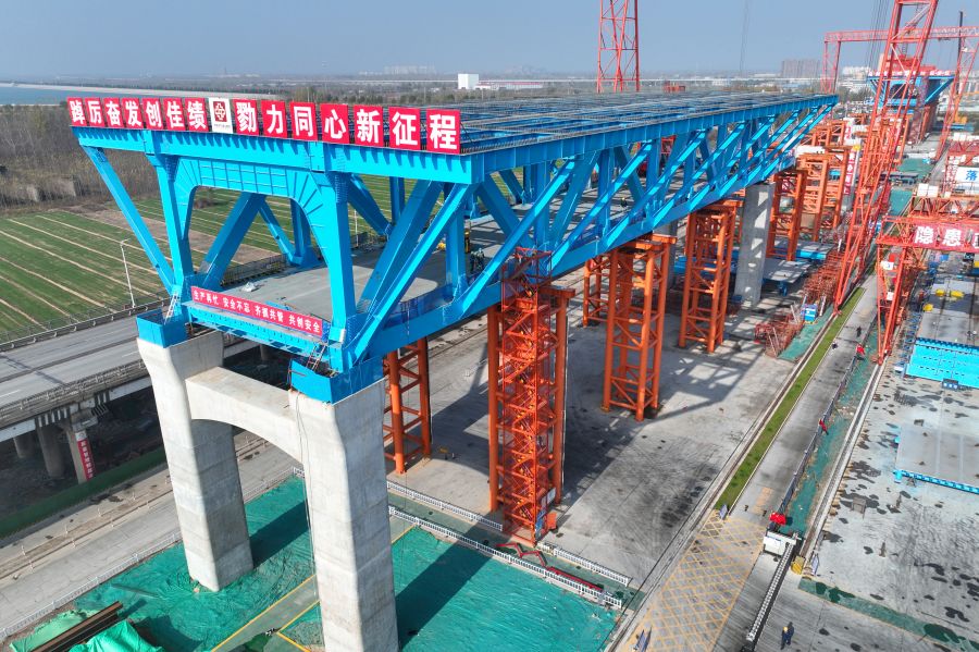 加强调度,保证原材供应。项目部克服封控、配车难等问题,加快材料招标,统筹调配生产计划,增设制造基地生产线,优先保障现场急需构配件发货,钢结构累计安装完成5800吨,现场主桥、跨大堤桥、滩地引桥等建设全面开花。