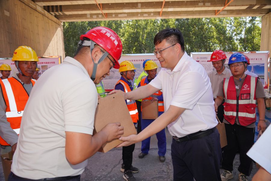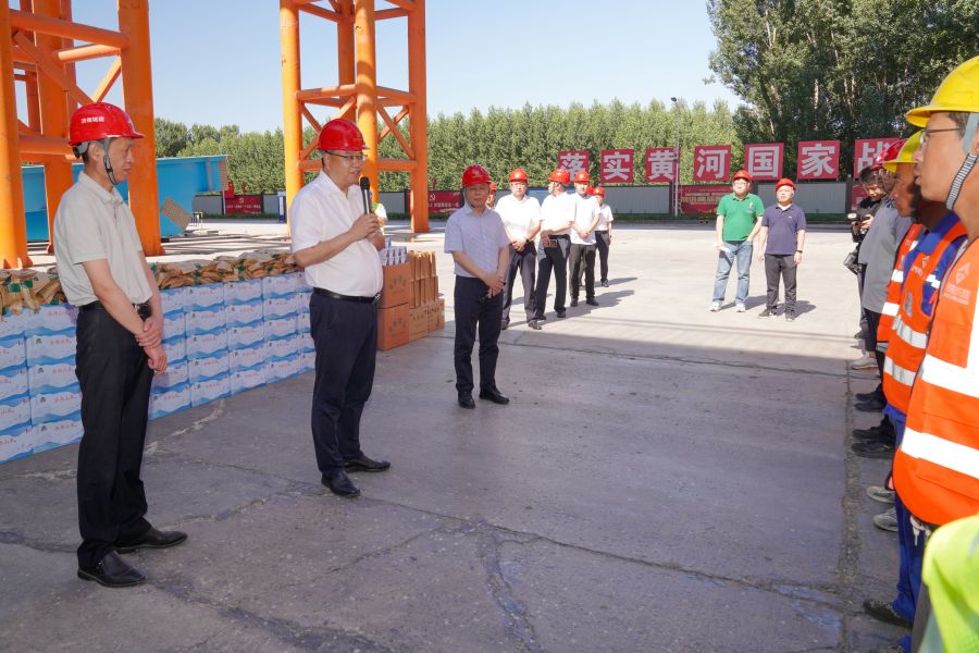 史海成董事长将防暑降温物品送到施工一线建设者手上,感谢工程建设者们为城市建设所付出的辛勤努力,叮嘱大家注意身体,合理安排作息时间,切实做好个人防护,保证安全作业。他强调,项目部要严格落实安全生产主体责任,确保各项防暑降温措施落实到位,切实保障施工人员的身体健康和生命安全,筑牢施工安全生产底线,不断提高工程质量、安全文明施工和整体服务水平,确保施工安全与项目进度两不误,为黄河流域生态保护和高质量发展作出贡献。