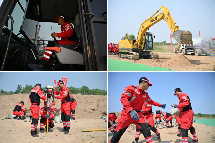 本次演练以持续强降雨为背景,模拟汛期黄岗路隧道工程现场遭遇强降雨、龙湖湿地水位急速上涨远超警戒水位、人员受困等突发场景,设置施工现场基坑客水漫灌、冲锋舟救援组营救被困人员、遥控挖掘机进行清障、沙袋修筑临时堤坝四项演练科目。集团各演练小组出动快速、分工明确,认真按照应急预案进行操作,演练过程衔接紧凑,抢险及报险程序流程顺畅。