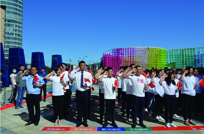 宣誓完毕后,所有人共同合唱《没有共产党就没有新中国》,伴随着嘹亮的歌声,一面党旗在队伍上面缓慢展开,站在党旗下,很多党员眼泛泪花,内心的自豪感油然而生,感谢伟大的党、伟大的祖国为我们创造了这么美好的幸福生活,这也把整个活动推向了高潮。